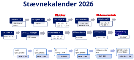 11. | Eventuelt: · Krav til klubtøj er fortsat Fusion Tempo dragt med sort underdel og hvid/magnesium overdel. Der skal køres med klubtøj med logo ved DM og Klubmesterskab. · Bestyrelsen arbjeder på at nedlægge vores hjemmesige og kun anvende Klubmodul fremover. Dette skyldes at holde udgifter nede samt at samle og opdatere information ét sted. · Fremtidig svømme-setup: Der er stemning for at prioritere at fortsætte med Marcus Appel både mandag og ondag på kanten. Opdatering. Denne aftale er indgået, så Marcus Apple fortsætter som svømmetræner i 1. halvår 2026 · Træningskalender for 2026: o Fortsat svømning mandag og onsdag kl. 20.00 o Fortsat cykling fra REMA1000 lørdag kl. 9.00 o Løb og øvrig træning planlægges adhoc og via Facebook · Stævnekalender/oversigt er printet, uddelt og ligeledes delt på Facebook (og ses også i Bilag 3). · Klubmesterskab: Det er besluttet at Klubmesterskab 2026 afvikles til Kalkgravstri d. 6. juni 2026 (hvor der også afvikles sprint DM), så startnummer kan med fordel købes allerede nu (pris stiger til nytår) · Træningslejre i foråret: o Forslag til træningslejr v. Gardasøen i Påsken 2026 deles af Jesper Grønbek o Oplæg til træningslejr i Sverie til foråret deles senere af Jeanette Sørensen | - |